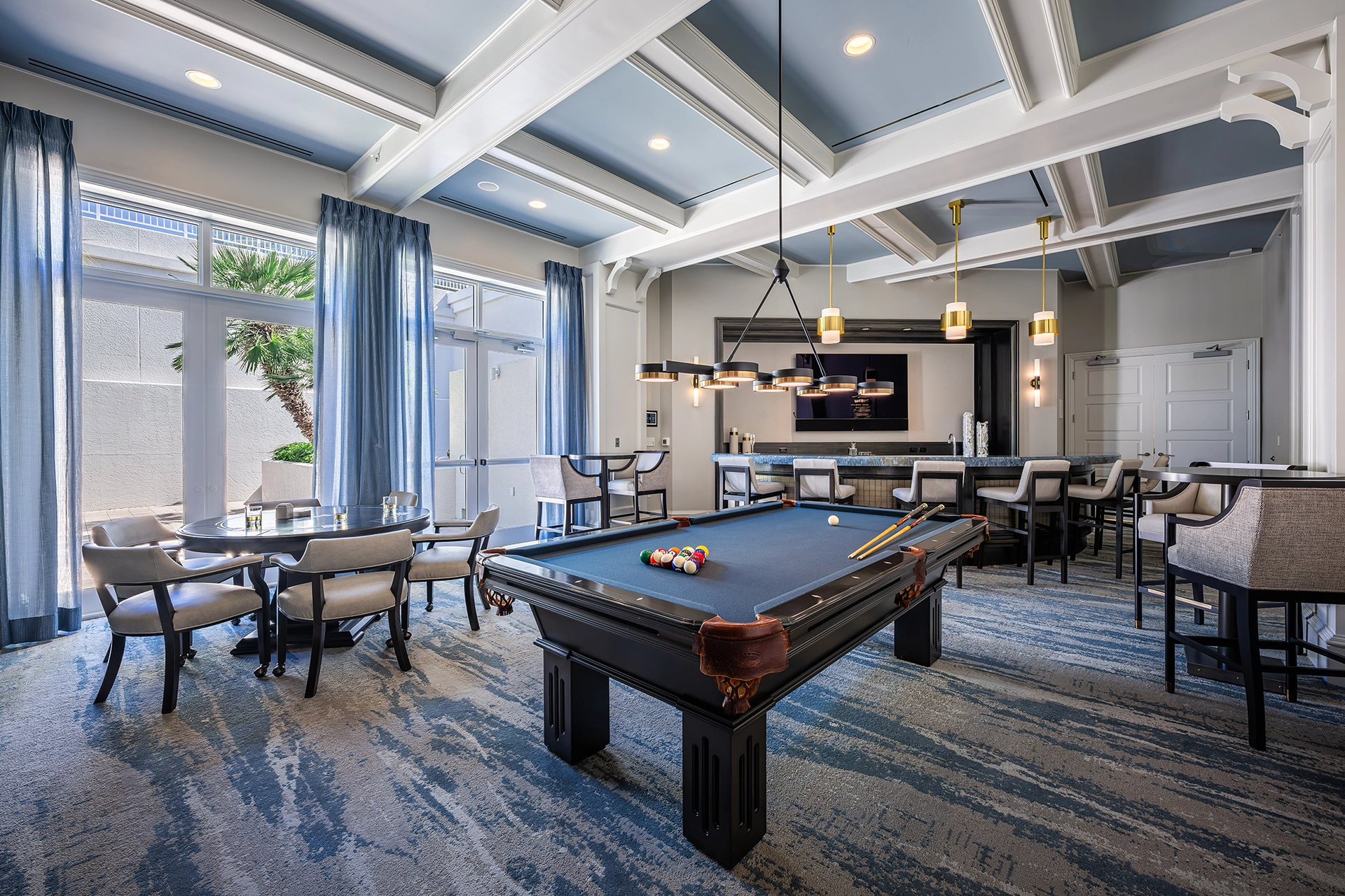 The newly completed spaces—including the Social Room, Card Room, and Billiards Room—have been thoughtfully redesigned to reflect both form and function. At the heart of the Social Room, a bespoke fireplace feature wall anchors the space, complemented by a custom-designed bar that invites connection and entertaining. Flexible seating arrangements now effortlessly transition from intimate gatherings to larger community events, while layered textures and refined finishes create a sense of warmth and understated luxury.